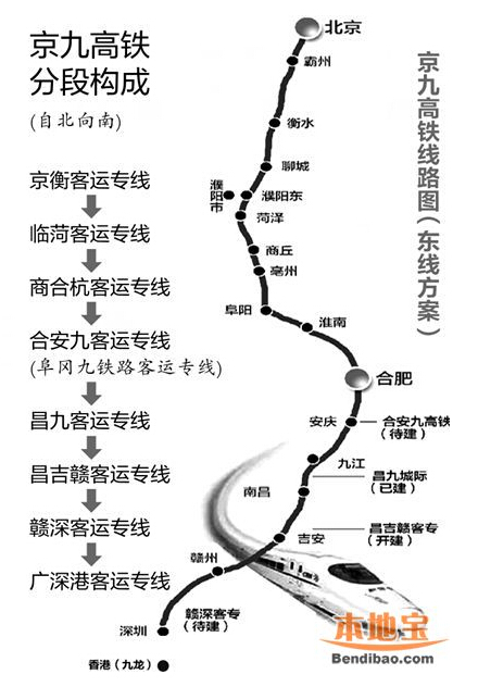 京九高鐵又稱京九客運專線,線路全長2000公里,設(shè)計時速為350公里,北起北京,跨越京、冀、魯、豫、皖、贛、粵七個省級行政區(qū),南至深圳,連接香港九龍,是連接環(huán)渤海和珠三角的重要高速鐵路干線。途徑北京、霸州、任丘、河間、衡水、清河(邢臺)、臨清、聊城、臺前(濮陽)、梁山(濟寧)、菏澤、商丘、亳州、阜陽、淮南、合肥、安慶、九江、南昌、吉安、贛州、河源、惠州、深圳,最后到達(dá)香港九龍。主要由北京至衡水客專(京霸段預(yù)計2019年建成)、臨菏客專(臨清—菏澤)、商合杭高鐵(商丘到合肥段已經(jīng)建設(shè))、合安九客運專線(阜陽到九江段),昌九客運專線(九江—南昌)、昌贛客運專線(南昌—贛州)和贛深客運專線(贛州—深圳)和廣深港客運專線(深圳—九龍)接駁而成。京九高鐵商丘以南段將先期建成通車,待北京到商丘段的規(guī)劃建設(shè)完成,京九高鐵將逐步形成。本專題將為您介紹2015京九高鐵最新消息和京九高鐵通車時間,幫助您了解最新資訊,方便你的出行。
