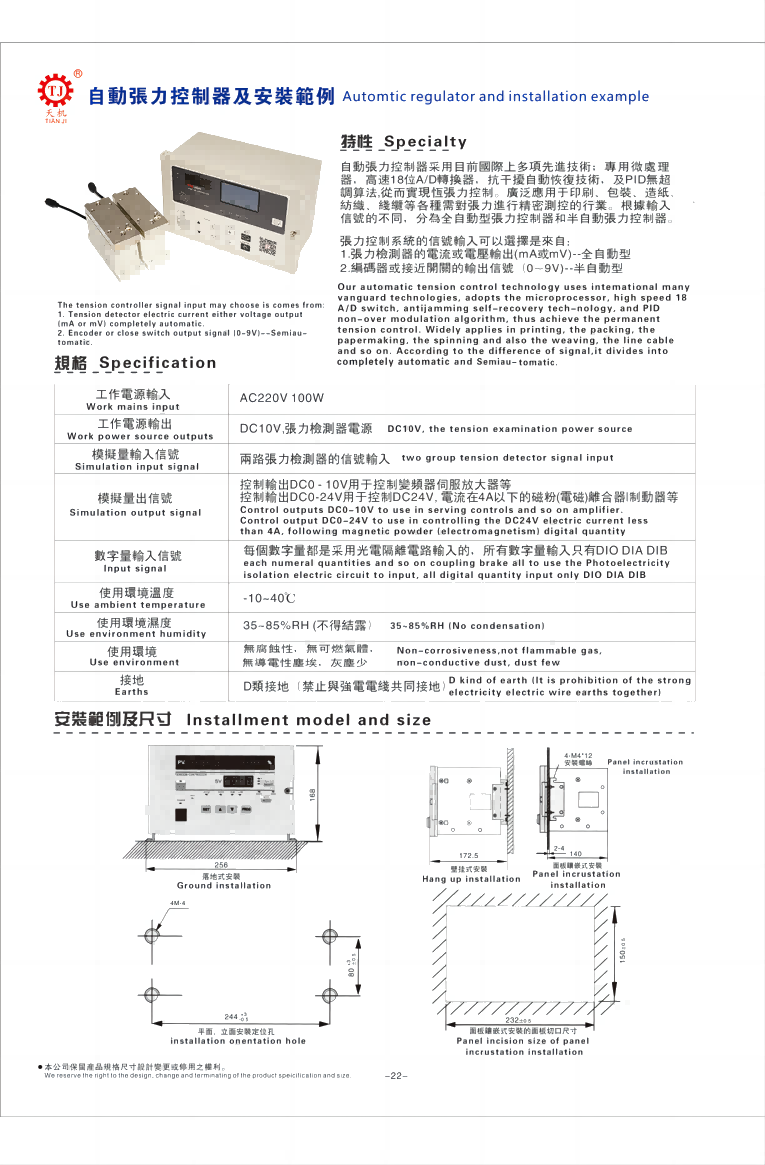 磁粉手動張力控制器,收卷放卷手動張力控制器一般應用于長尺寸材料的收卷、放卷、張力控制系統(tǒng)。在卷徑變化較小的放卷、收卷控制或者中間軸控制時,進行了使用磁粉制動器、磁粉離合器的手動控制(轉矩)。在機械停止時執(zhí)行緊急控制,或在運轉過程中進行調節(jié)旋鈕運程操作。手動張力控制器是依據(jù)收料或者出料卷徑的變化,而分階段調整磁粉離合器與磁粉制動器的激磁電流表,從而獲得一致的張力,達到恒定。同類產(chǎn)品還有全自動張力控制器,該型張力控制器在技術上是比較先進,可省時間、省人工。由于使用了張力檢測器的閉環(huán)式張力控制器,根據(jù)外部順控程序進行多軸切換控制時基于輥筒切換輸入信號執(zhí)行控制輸出的新軸預置控制,此類型張力控制器必須在外部執(zhí)行預驅動控制。手動張力控制器安裝方式有落地式安裝、壁掛式安裝、面板鑲嵌式安裝三種常見的。